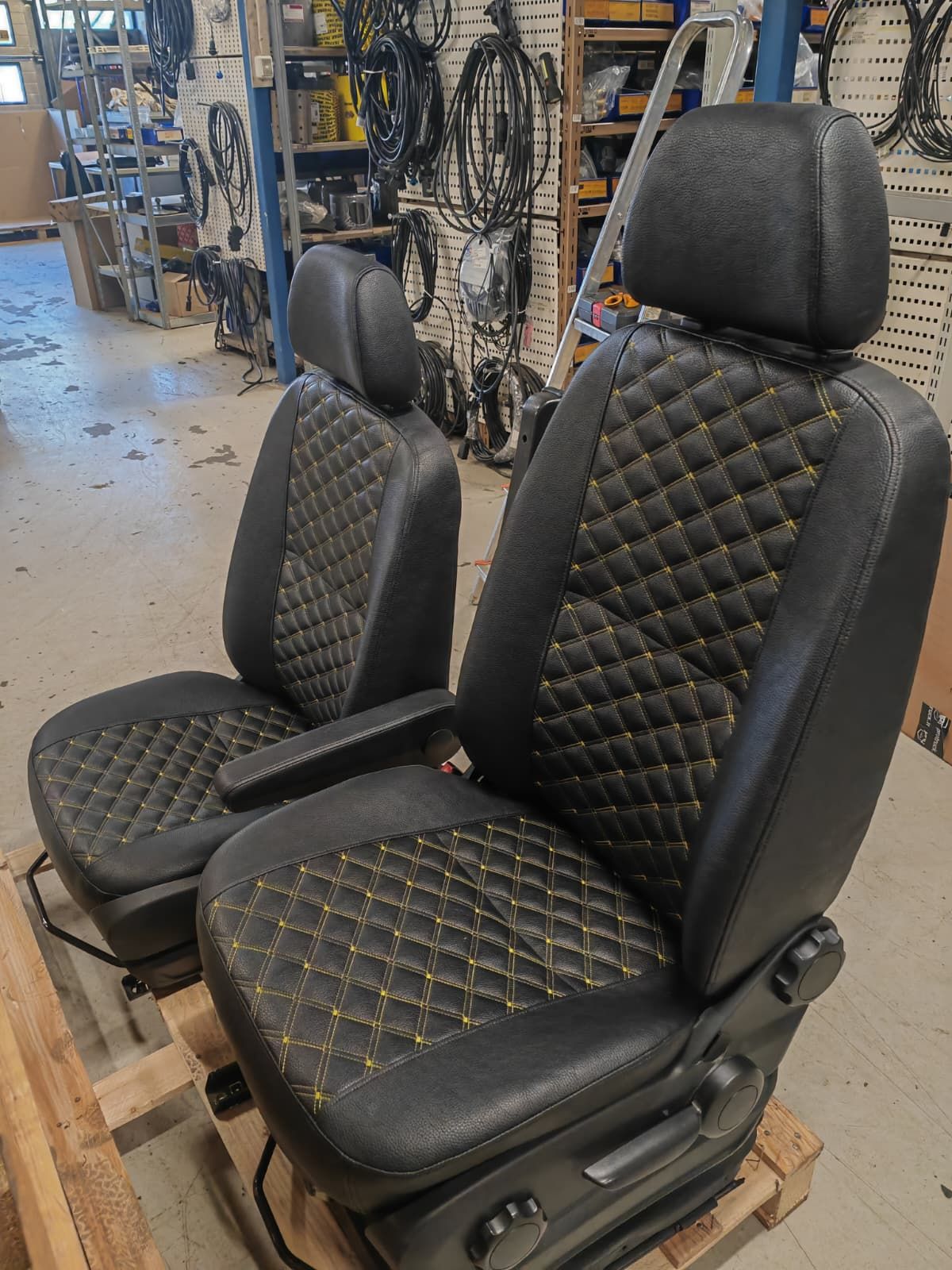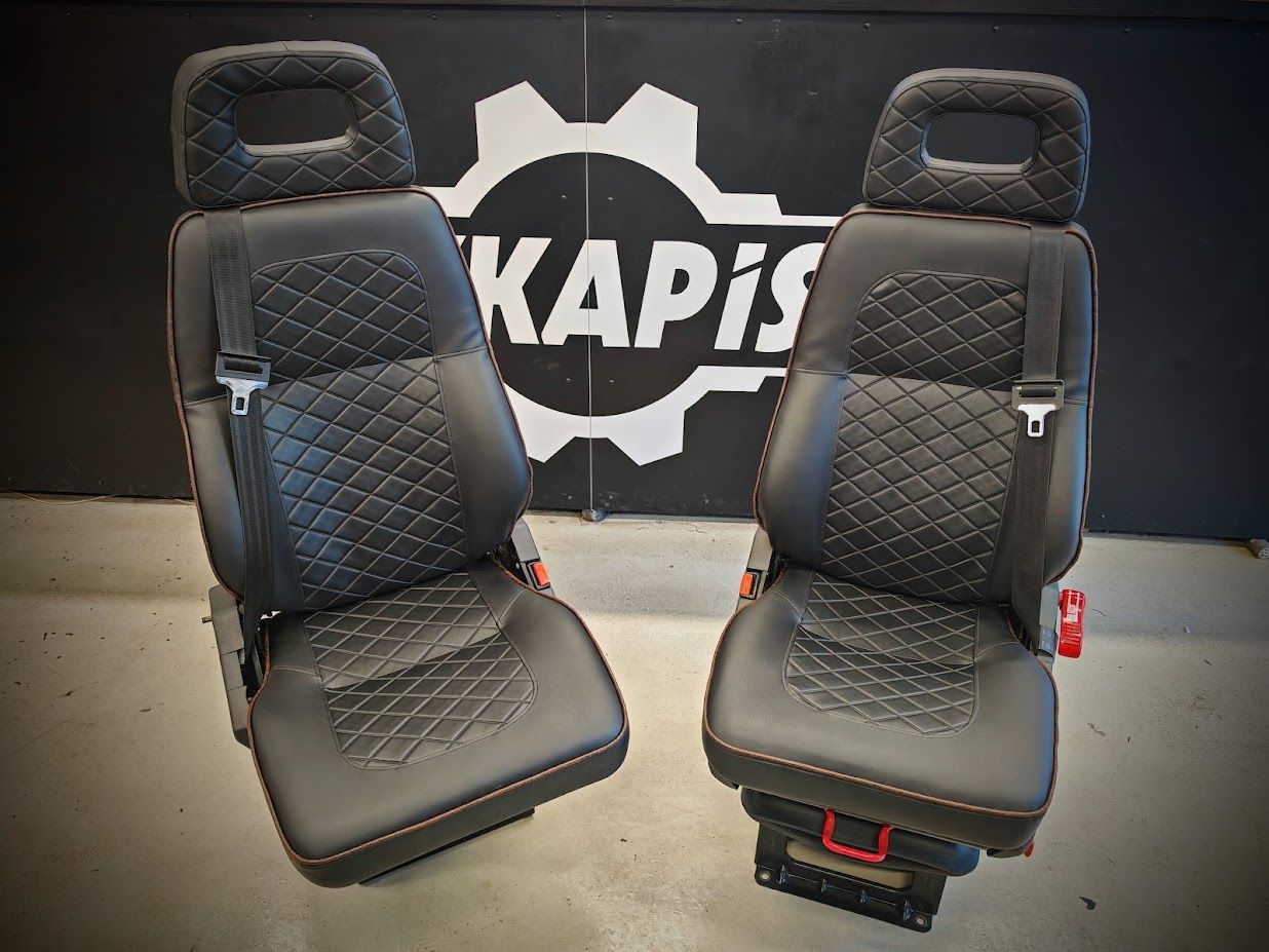 Volvo FH12 istuimet. Istuimet olivat aiemmin kangasverhoillut. Kuljettajan istuimen verhoilu sekä vaahtomuovi olivat murentuneet pahoin. Uutta ilmettä saatiin lämpösaumatulla keskiosalla ja klassisella mustalla nahkalla.