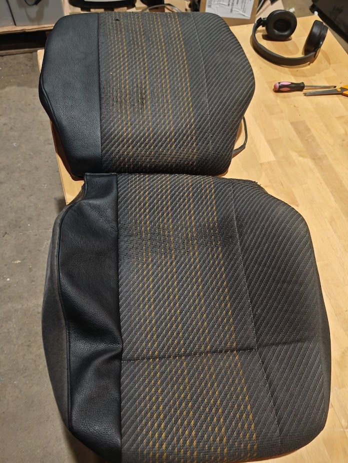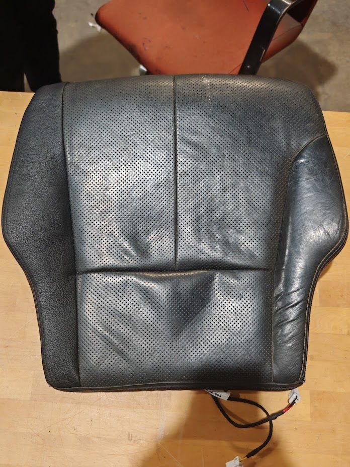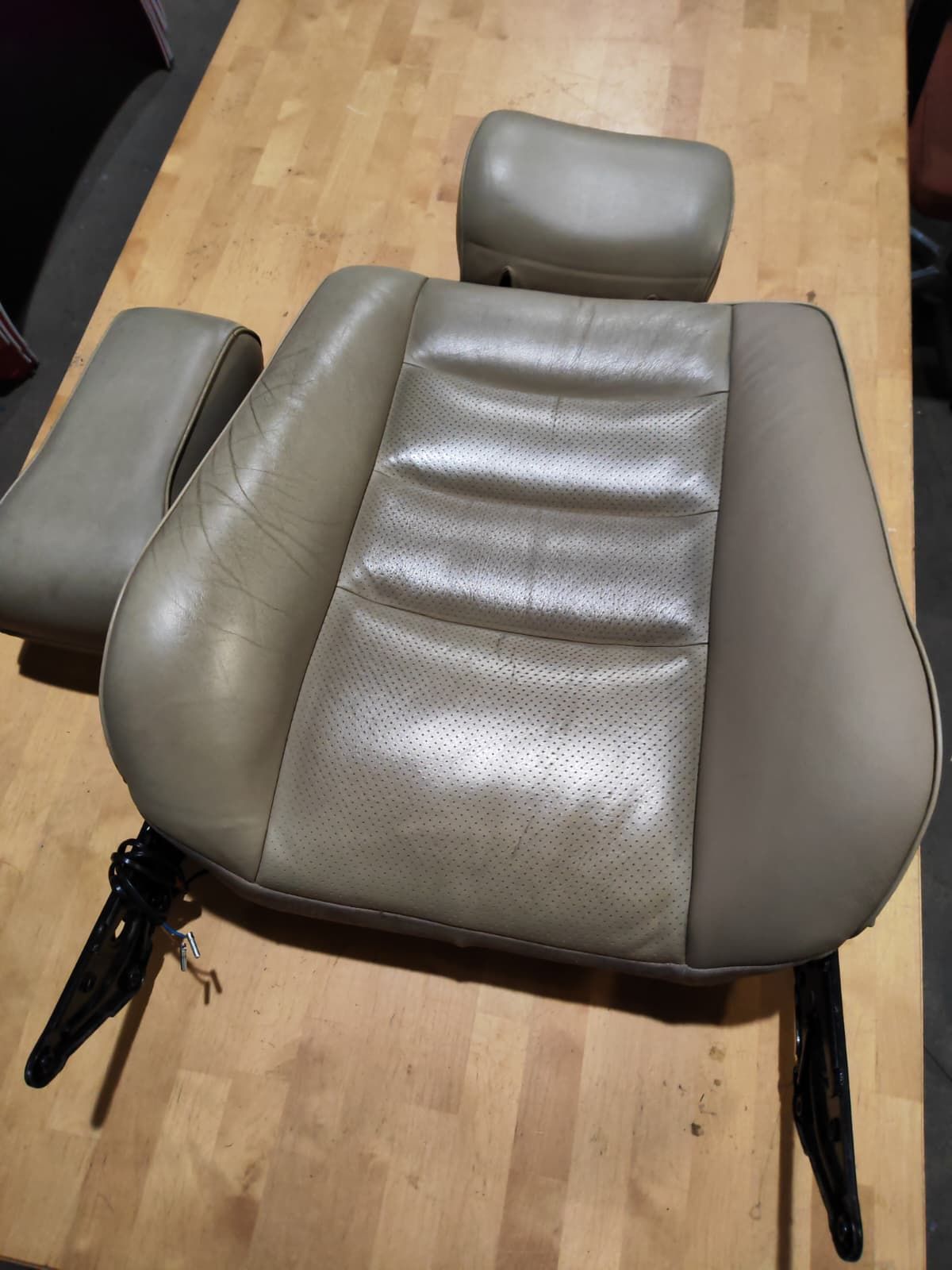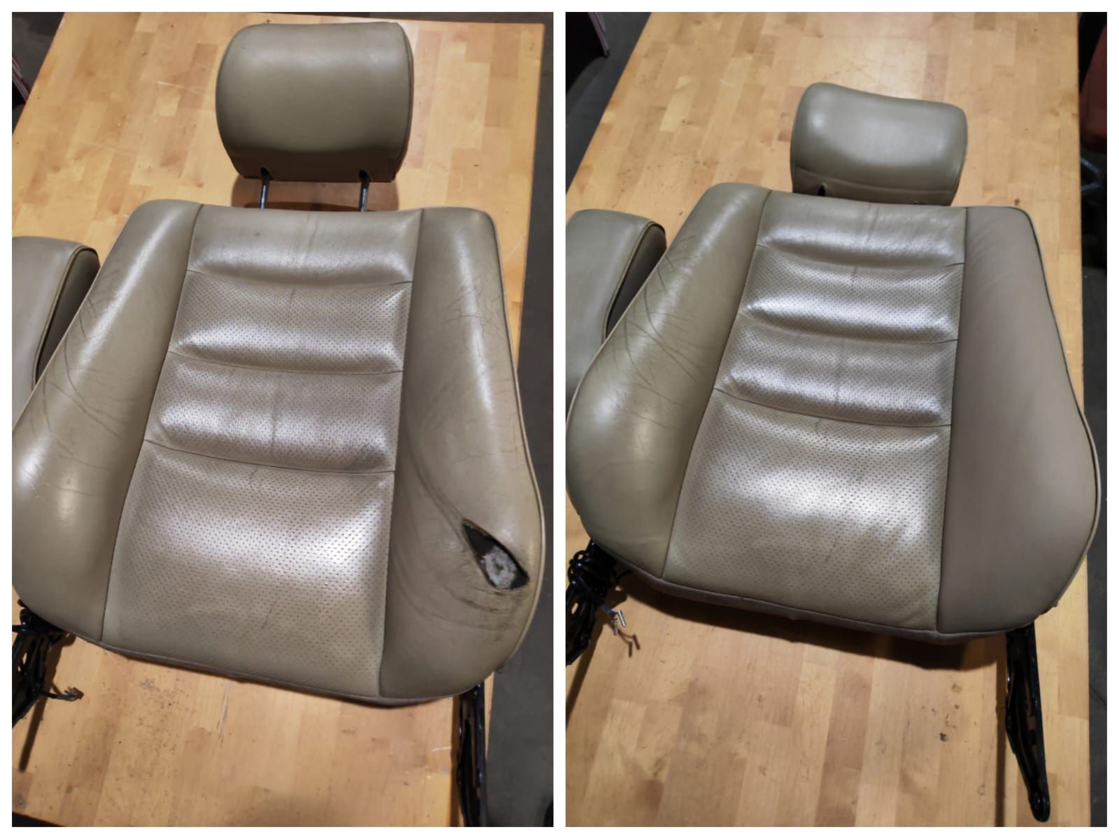 W124 Mersun kuljettajan istuimen selkänoja oli nähnyt kilometrejä liikaa ja nahka oli kuoritunut pois. Tilalle laitettiin alkuperäistä mercedeksen nahkaa.