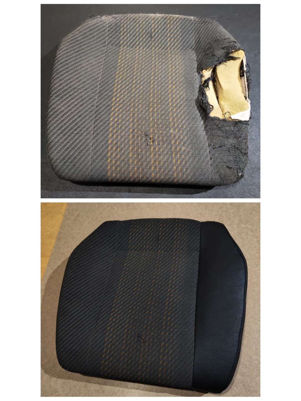 Asiakkaalla oli Scanian istuimen vasemmanlaidan nahkaosa revennyt pahoin ja pehmuste murentunut. Pehmuste korjattiin sekä laitettiin uusi nahkakaistale istuimen laitaan.